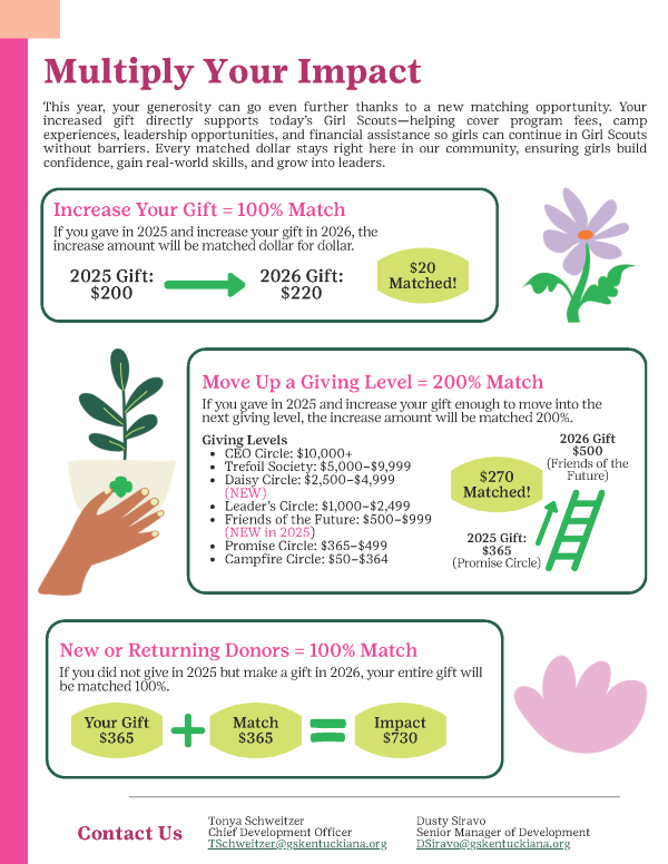 Girl Scouts of Kentuckiana invites you to join us in a campaign that ensures that we can provide Girl Scouting to all girls 365 days a year. For just $1 a day ($365 per year), anyone can be a partner in building girls of courage, confidence, and character, who make the world a better place.